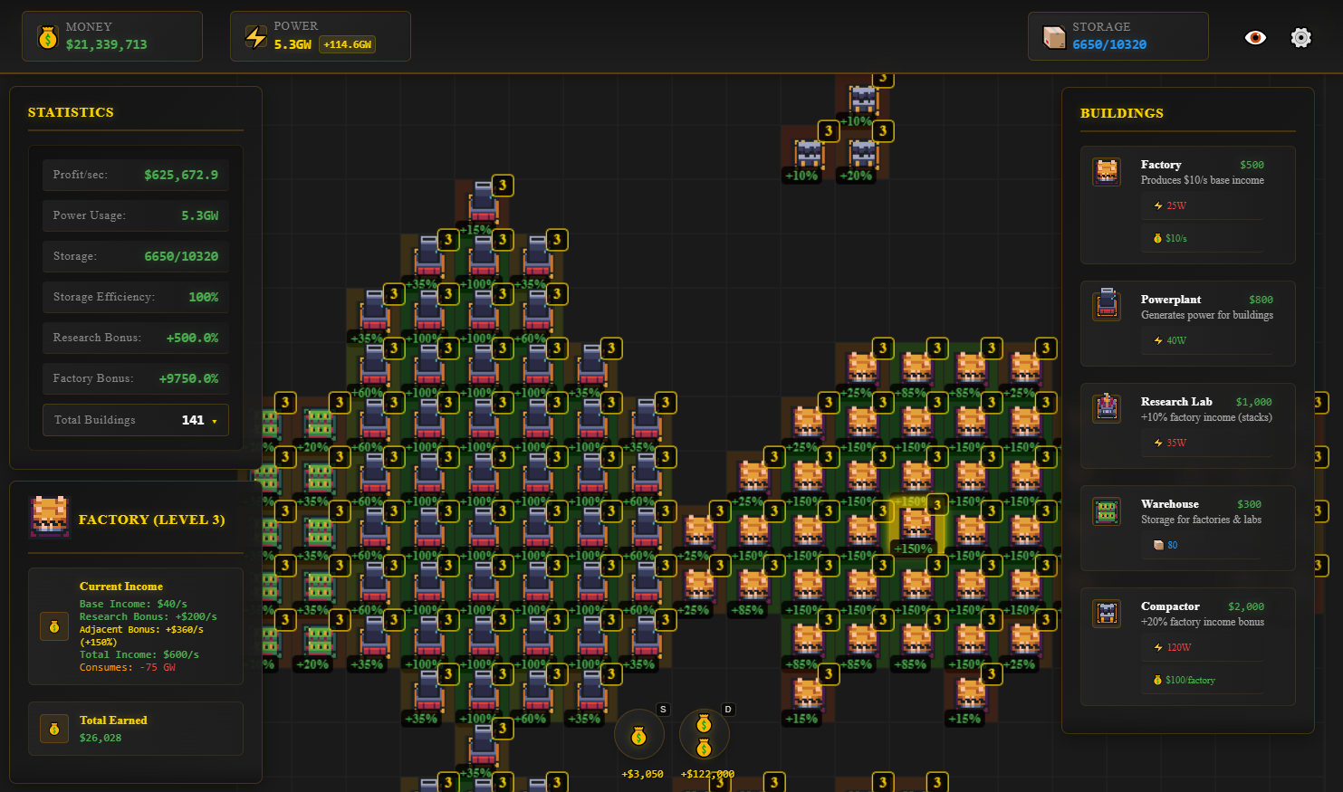 Build and manage an ever-growing network of factories, power plants, and research facilities in this addictive idle game. Place buildings strategically to maximize their efficiency through proximity bonuses and upgrade paths.