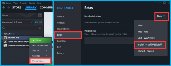 So I uploaded the English translation mod made by enthusiastic players to the beta version, you need: 1. Right-click the games list on the left of steam and select the game. 2. Select the Properties button. 3. Select the Betas TAB and select "english" beta. 4.Wait for the game update to complete, enter the game.